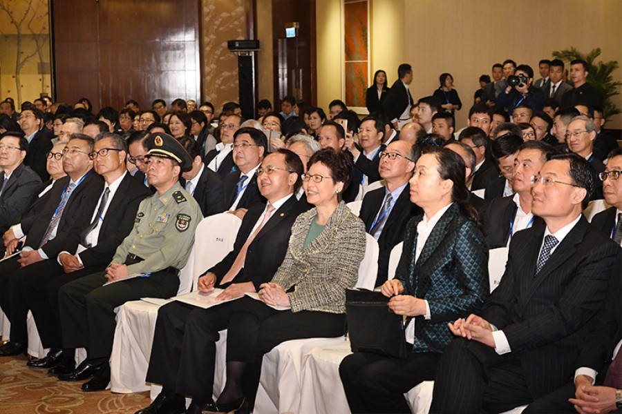 (由左至右) 香港金融管理局總裁陳德霖、食物及衞生局局長陳肇始、中央人民政府駐香港特別行政區聯絡辦公室(中聯辨)秘書長文宏武、立法會主席梁君彥、中聯辦副主任黃蘭發、政務司司長張建宗、 中華人民共和國外交部駐香港特別行政區特派員公署特派員 謝鋒、全國人大常委會法制工作委員會副主任鄭淑娜、 行政長官林鄭月娥、全國政協副主席董建華、中聯辨主任王志民、 香港願景計劃召集人曾鈺成、解放軍駐香港部隊副司令田永江、財政司司長陳茂波先生、中華人民共和國外交部駐香港特別行政區特派員公署副特派員楊義瑞、香港政策研究所主席葉國華、 保安局局長李家超、全國人大常委會香港特區《基本法》委員會副主席梁愛詩、香港願景計劃執行及研究總監馮可強在開幕禮上合照。